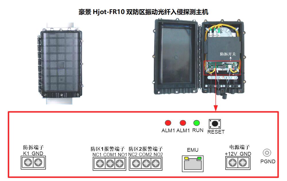 豪景Hjot-FR10双防区振动光纤入侵探测主机分为室内应用和室外应用,支持1-2个防区,可广泛应用于机场、仓库、文物保护单位、军事重地及别墅区等安保环境中。