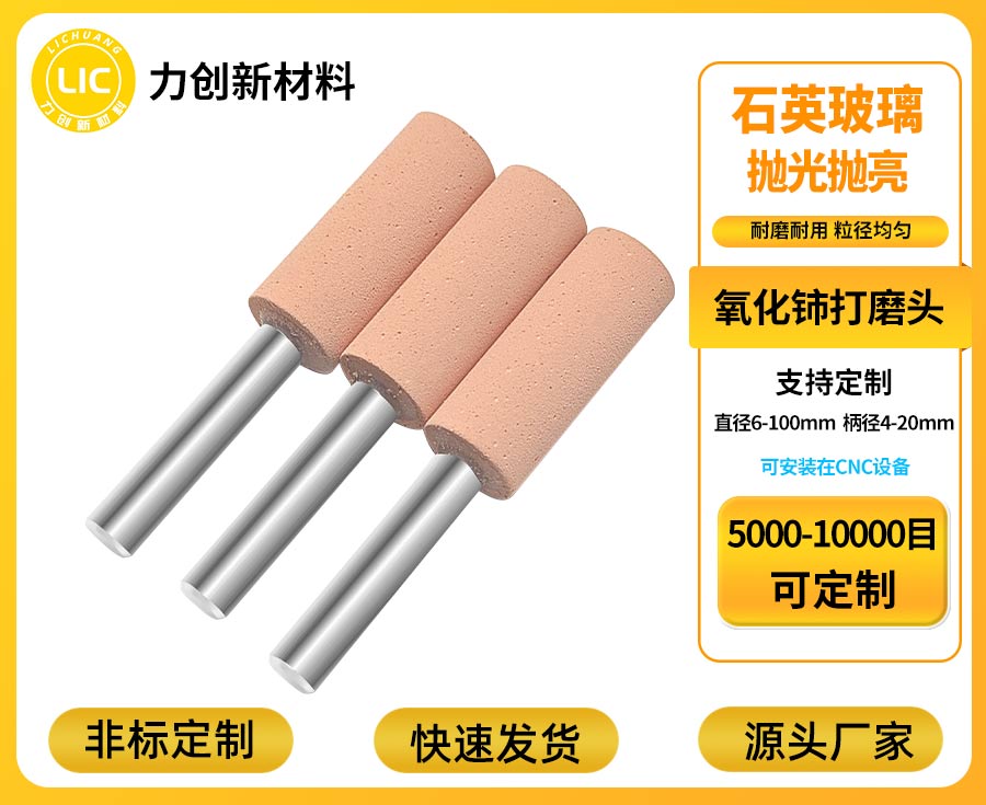 氧化铈打磨头的适配设计贴合自动化生产需求,衔接更顺畅。采用标准化接口的氧化铈打磨头,无需对现有自动化设备进行复杂改装,经过简单调试就能快速完成对接,平稳融入生产流程,有效降低企业设备升级的时间与人力成本。在抛光效果上,氧化铈打磨头搭载均匀分布的磨料颗粒,与玻璃表面接触时受力均衡,无论是处理石英玻璃的顽固刀纹,还是清除光学玻璃的毛刺与白边,都能精准发力,让玻璃成品表面呈现出一致的平整透亮质感,彻底解决人工抛光易出现的品质波动问题,为批量生产的品质标准化提供有力支撑。
