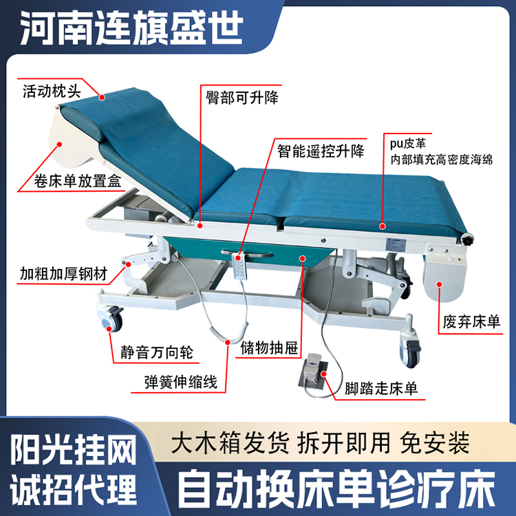 - 自动换单 + 双控操作,解放医护双手自带全自动换床单装置,完美适配连旗一次性卷床单,10 秒一键换单,一人一单杜绝交叉感染,符合院感防控要求;手柄 + 遥控器双控设计,医护无需弯腰,坐立间即可完成调位和换单,大幅节省操作时间,提升诊室周转效率。