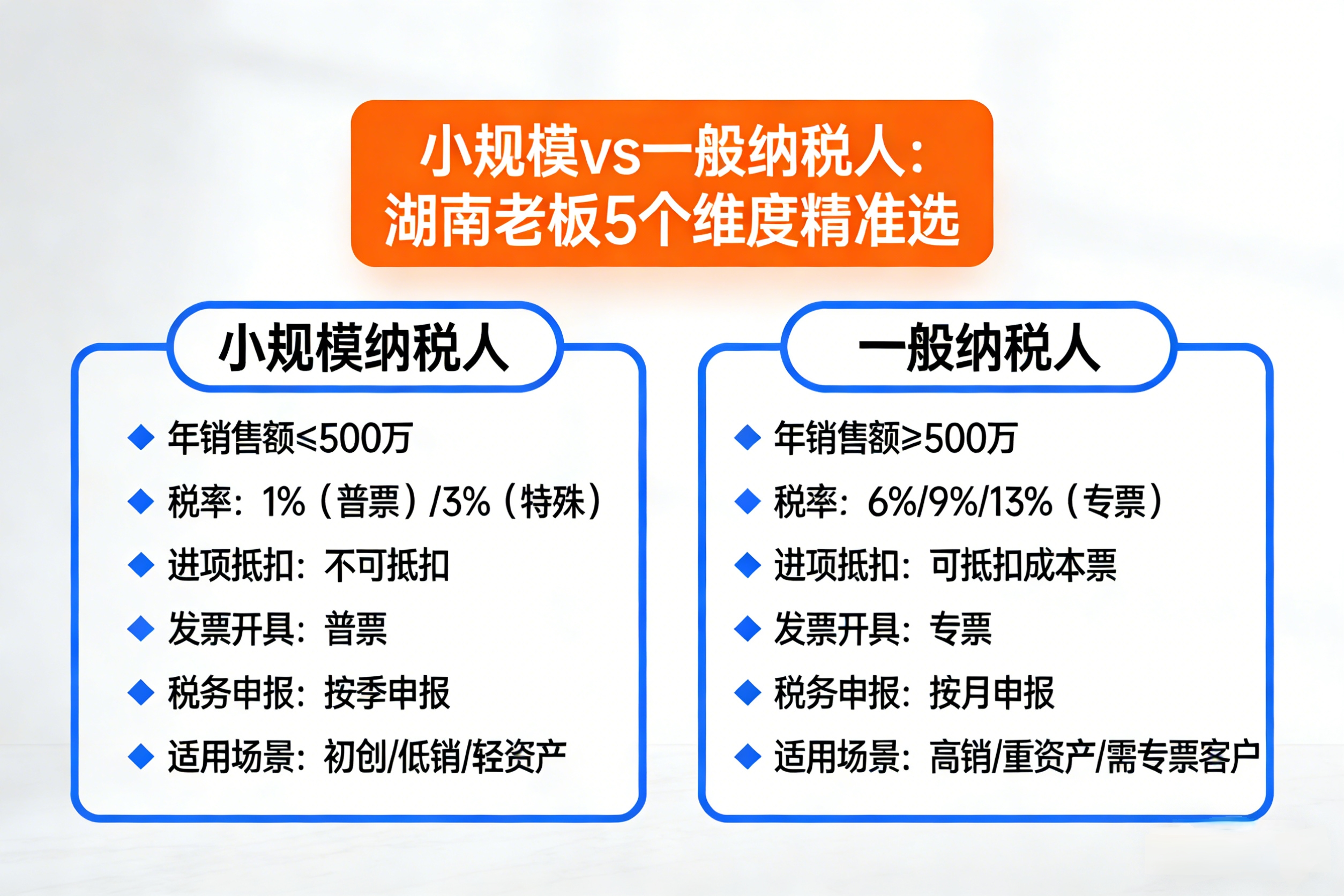 初创期企业 → 建议先选小规模纳税人,借助政策优惠减轻起步压力;待业务规模扩大、客户结构升级后,再按需申请转为一般纳税人。